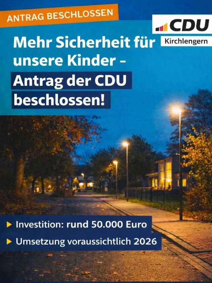 In der letzten Sitzung vom Ausschuss für Planung, Straßen und Verkehr der Gemeinde Kirchlengern wurde der CDU Antrag für die Verbesserung der Straßenbeleuchtung des Schulweges an der Grundschule Südlengern einstimmig beschlossen. Die Verwaltung hatte aufgrund des Antrages den Schulweg hinsichtlich der Beleuchtung überprüft und stellte dabei ebenfalls fest, dass die Straßenbeleuchtung an einigen Streckenabschnitten nicht ausreichend ist. In der Sitzung wurde dann von der Verwaltung berichtet, dass nun eine Neuerrichtung von 15 Leuchten, sowie das Versetzen von 5 Leuchten geplant ist. Ein entsprechendes Angebot wurde bereits angefragt. Es wird mit der Umsetzung der Maßnahme in den Jahren 2026/ 2027 gerechnet. Dadurch wird die Sicherheit der Schulkinder auf dem Schulweg erhöht. Die CDU Ratsfraktion bedankt sich bei der Verwaltung für die Umsetzung des Antrages und für die Zustimmung im Ausschuss. #sichererschulweg #mehrsicherheit #kirchlengern #wirkümmernuns #familie